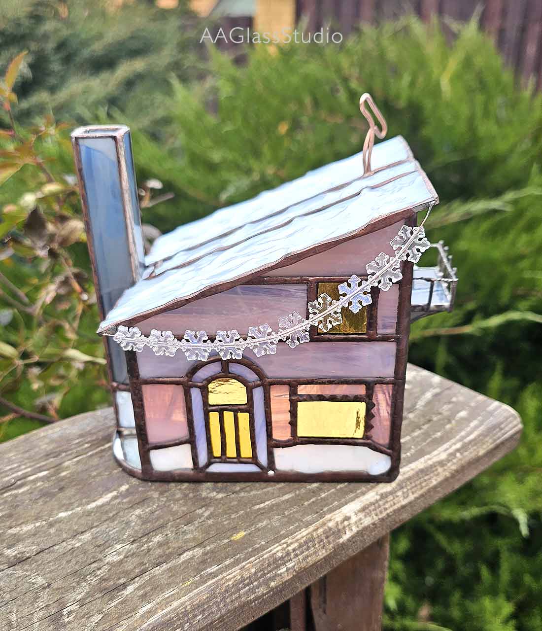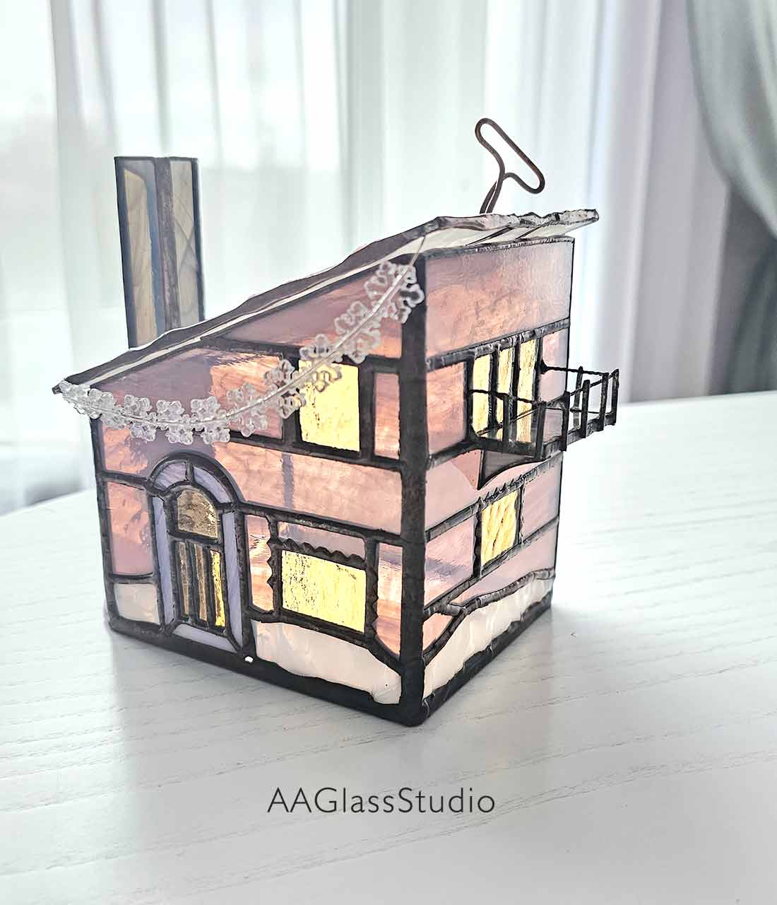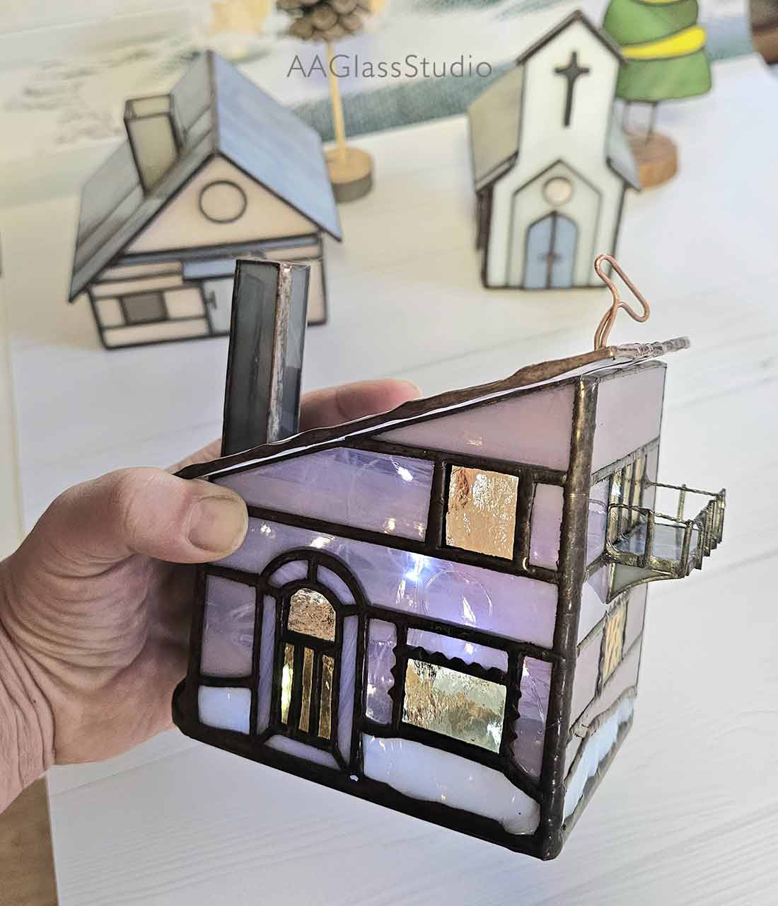 This stain glass house features exquisite details that make it truly unique. With its snowy white roof, lavender walls, and whimsical chimney, it radiates Christmas charm. The frosty windows, charming balcony, and delicate antenna on the roof add character, while the decorative accents enhance its allure. Place an LED light inside, and it transforms into a warm, glowing nightlight to brighten your evenings.