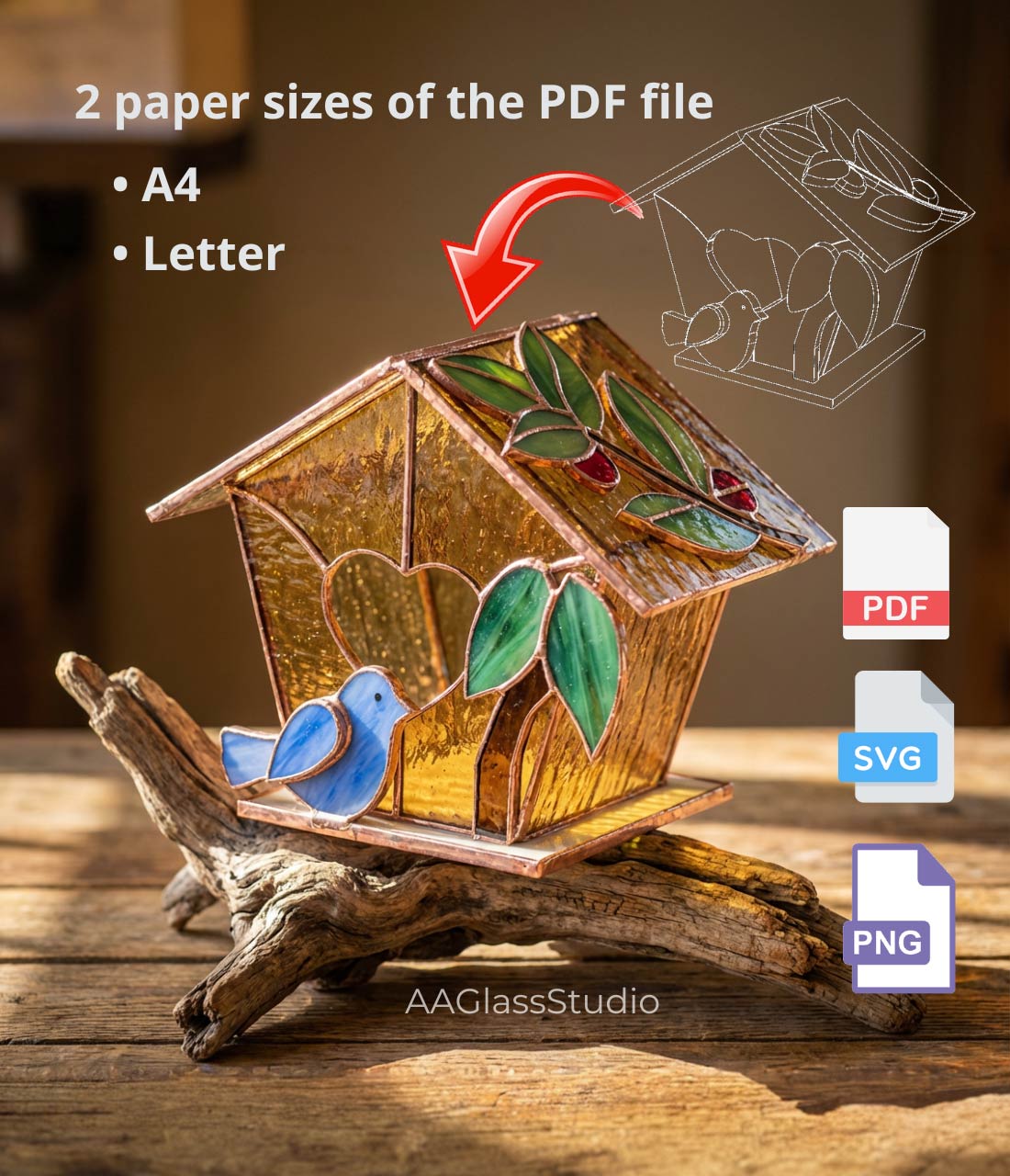 With 24 years of professional stained glass experience, we design patterns that balance beauty with practicality. Every stained glass birdhouse pattern we create focuses on:
