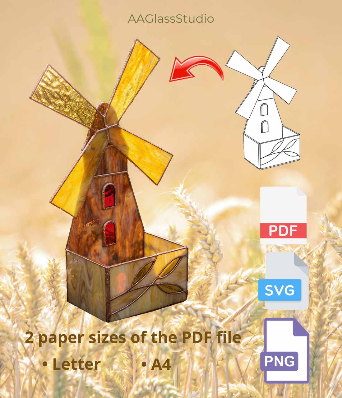 downloadable PDF pattern for a 3D stained glass windmill box using the copper foil