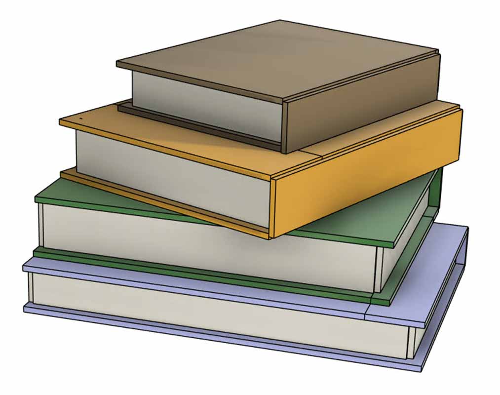 The first way to combine the two stacks is vertically. Books #3 and #4 are attached at an angle to the stack of Books #1 and #2. This can be done either with glue or by soldering. Apply a small piece of foil at the point of contact and tack it with solder.