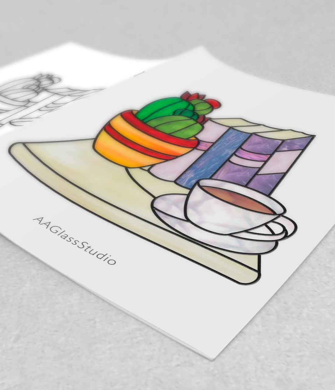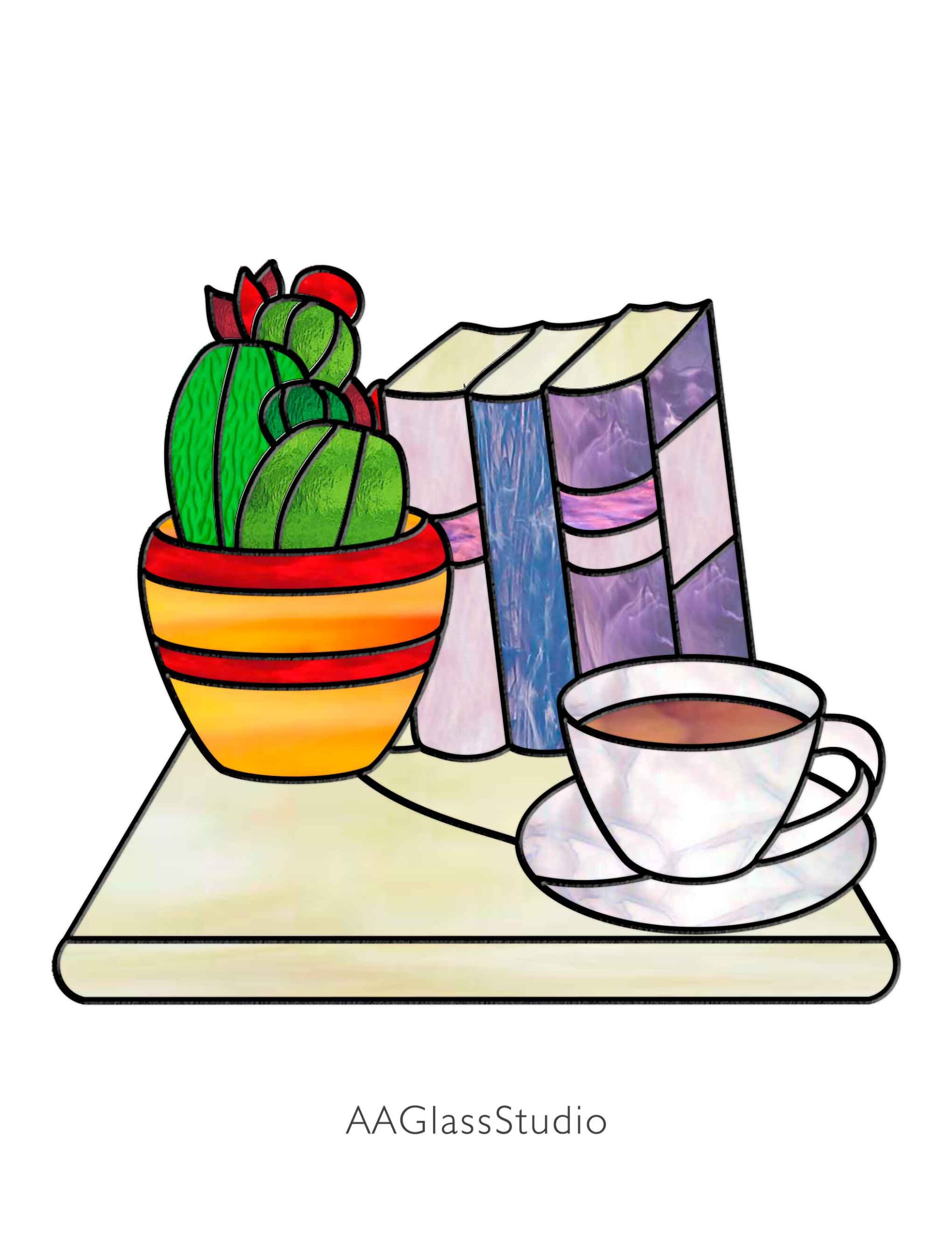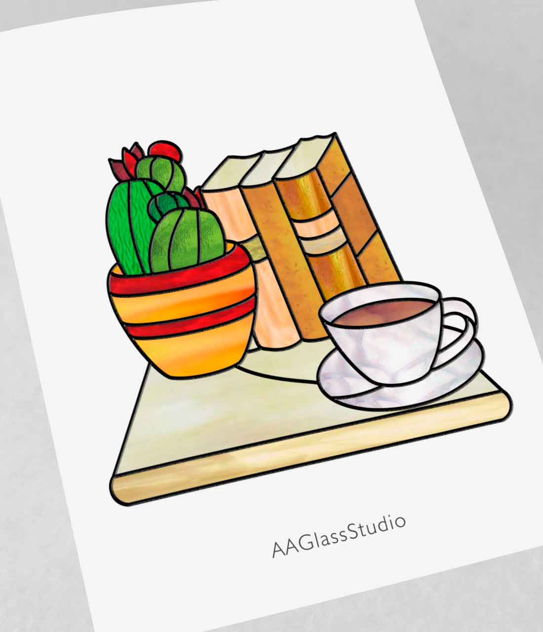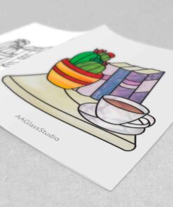 Every time you glance at this artwork, it’s like a gentle whisper to slow down. It reminds you of those cozy weekends when the world fades away, leaving just you, your books, and a cup of coffee. More than that, it’s a celebration of the little things—like the quiet beauty of succulents or the stories that shaped you. Grab this stained glass stack of books design and let it sprinkle some timeless magic into your life!
