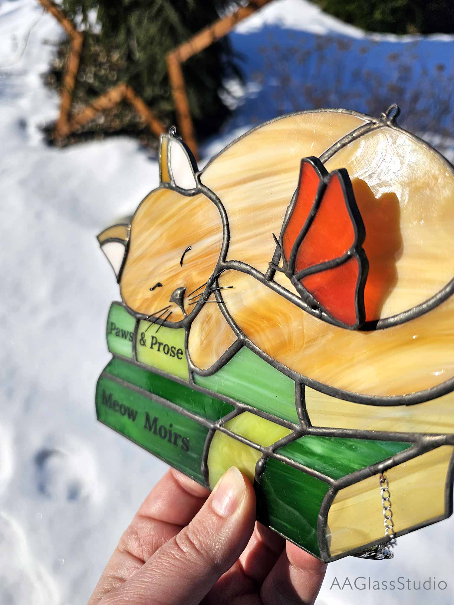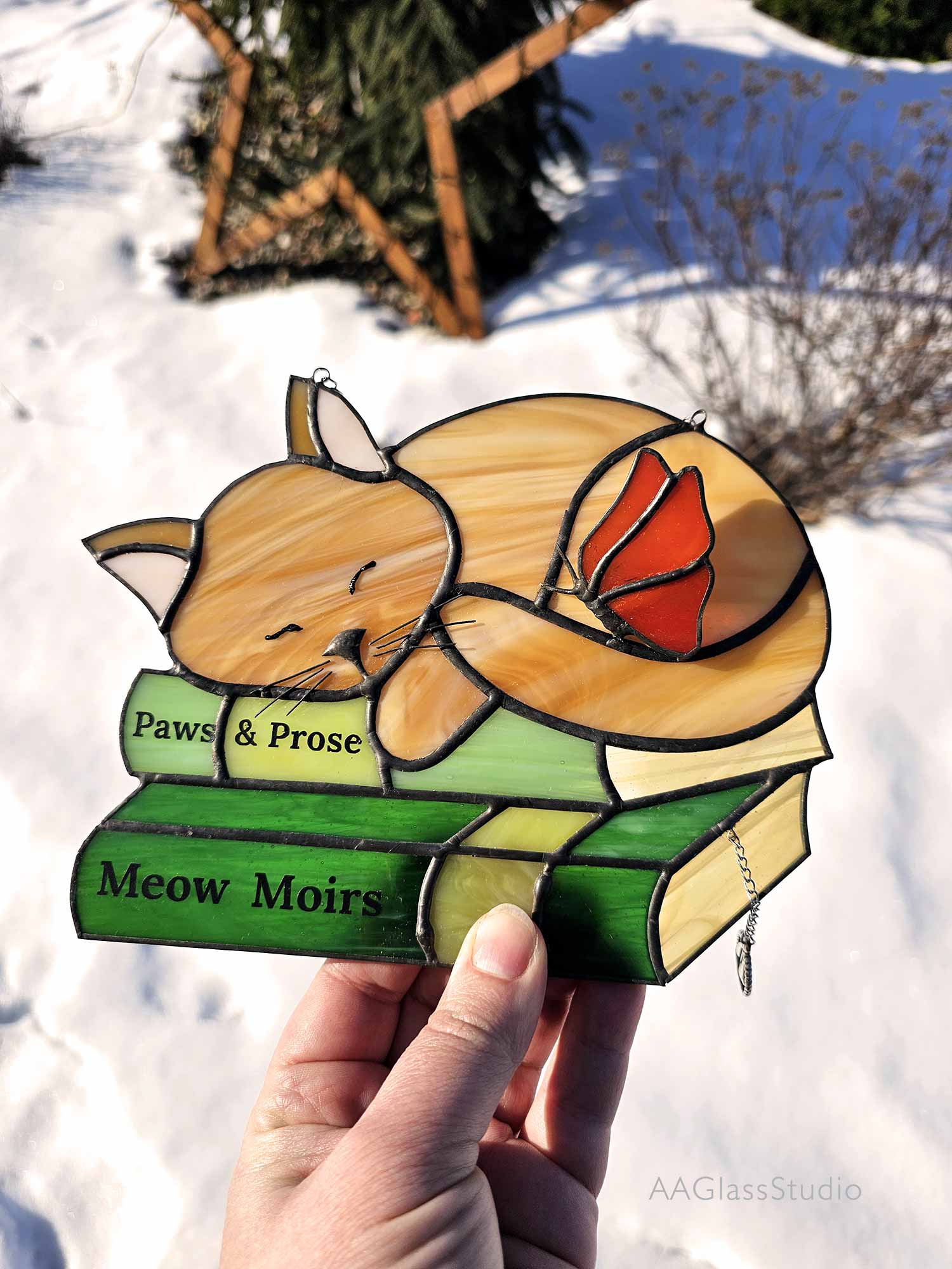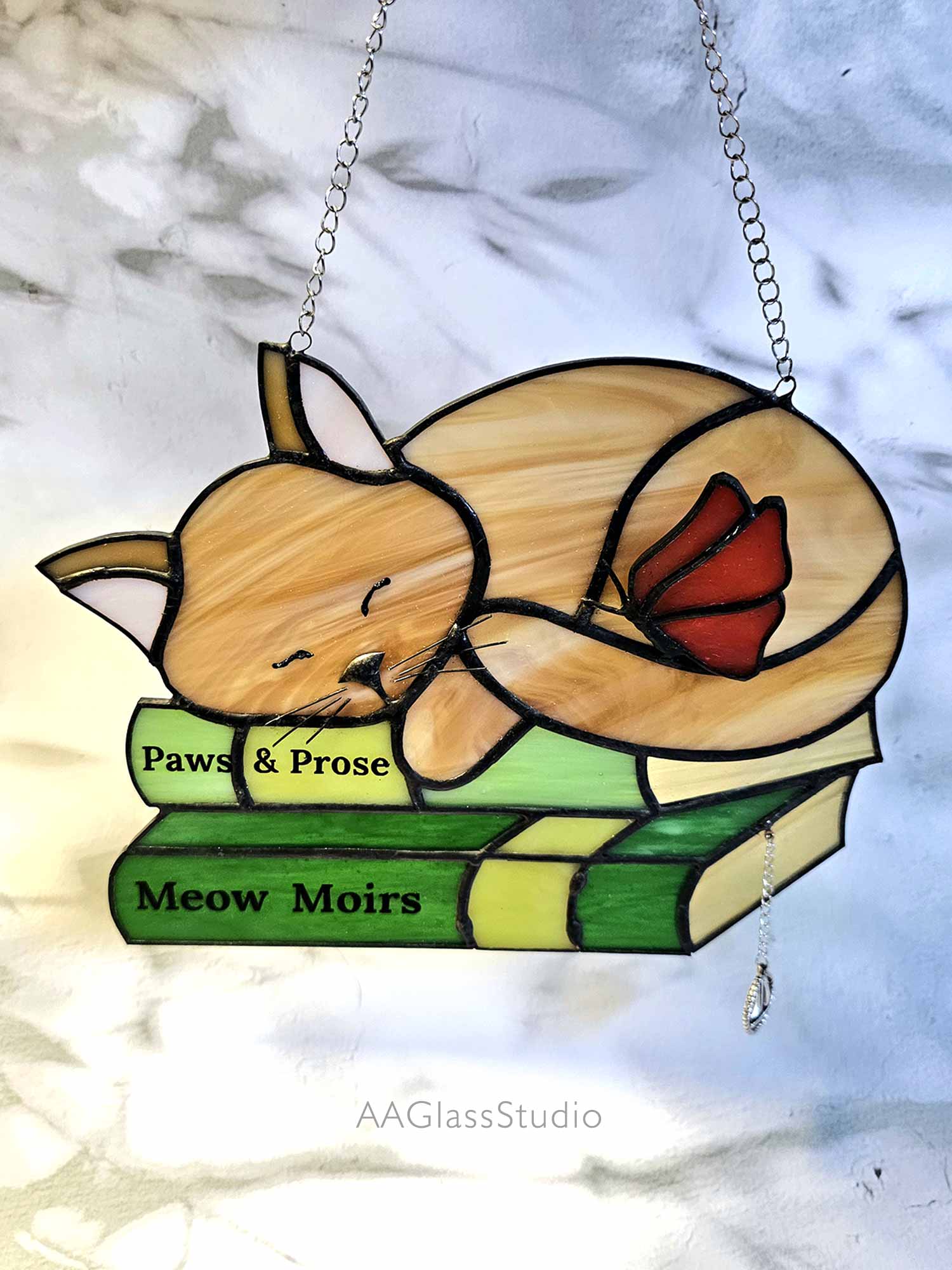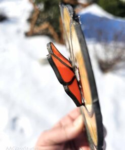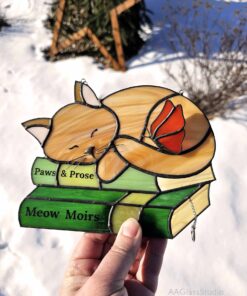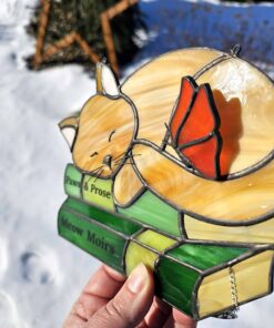 Imagine a lazy ginger kitty curled up on a stack of books, basking in the glow of a well-deserved nap. That’s the magic of this stained glass suncatcher—a treasure that brings a whimsical touch to your home. The butterfly perched atop the kitty adds a dash of charm, making it more than just decor; it’s a story of rest and warmth. If you crave a little peace in your busy life, this piece is calling your name.
