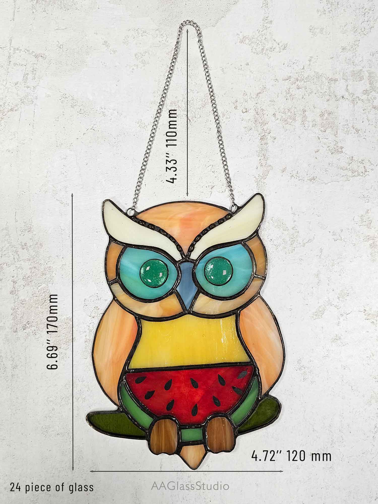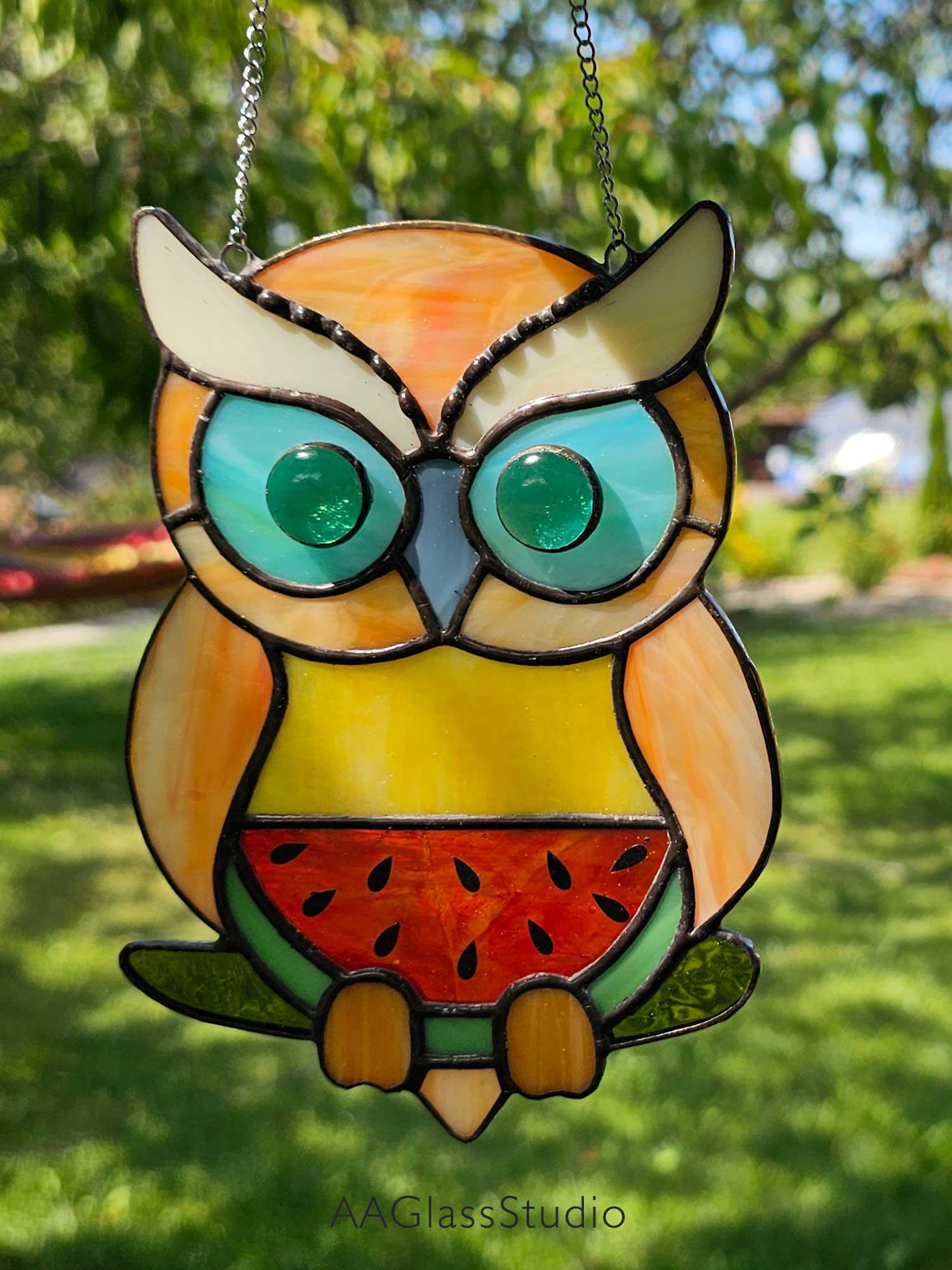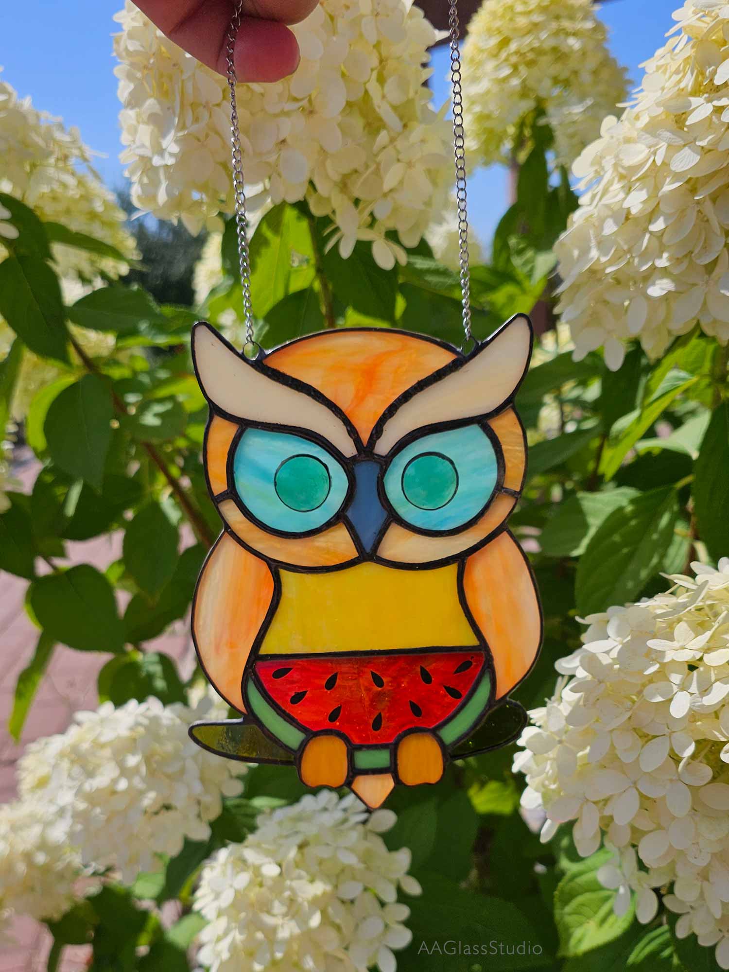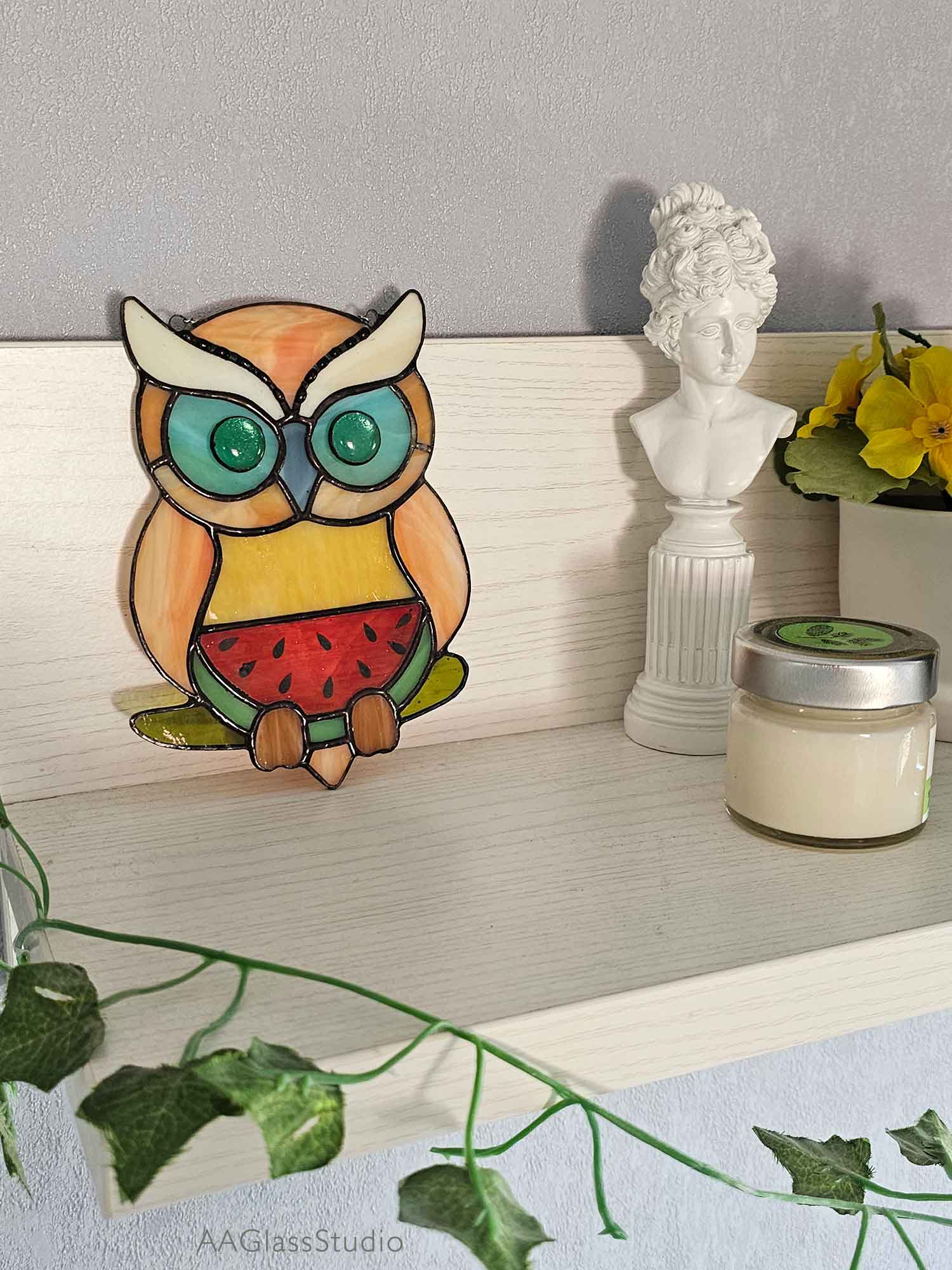 Crafted with meticulous attention to detail, this suncatcher showcases a playful owl savoring a watermelon slice.