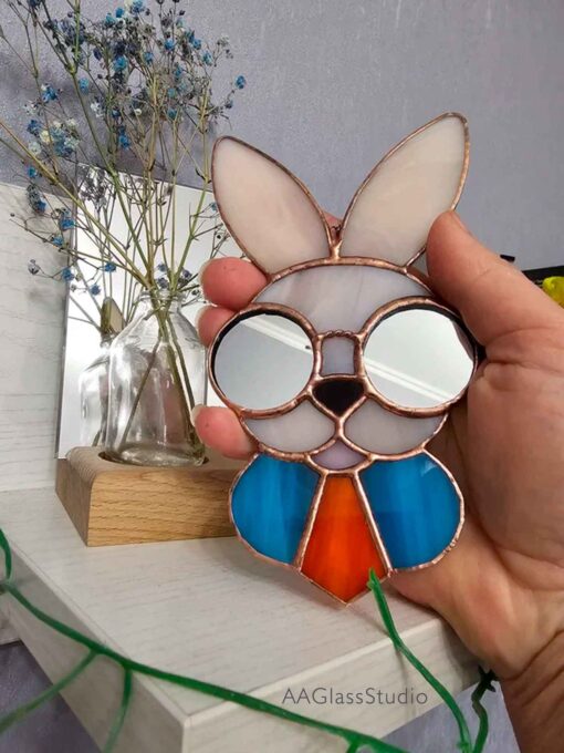 Crafted from high-quality stained glass, this bunny is a testament to skilled artistry. Every piece is carefully cut, assembled, and soldered to ensure durability and beauty. The combination of soft, milky hues and striking mirrored lenses gives it a unique and sophisticated look.
