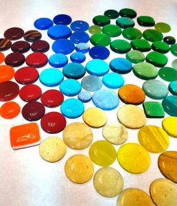 You will be able to make them yourself only if you have special equipment. This requires a fusing furnace. Cabochons are melted from the colored glass at a temperature of almost 790 degrees. To begin with, the glass cutter cuts out the bases of colored and transparent glass. You can use any colors you want. After that, the master makes cabochons of transparent and colored glass. You can put the transparent glass on top and then the cabochon will be more glossy. And if you put the colored glass on top, the color will be more active. After all the manipulations, the cabochons are carefully placed in the oven. We use a special plate for this purpose, which we coat with a special composition so that the glass does not stick to it. The baking process is not fast. After laying the blanks of the future cabochons, the oven is heated to 790 degrees, at this temperature it is kept for 20 minutes. Then the oven is turned off, opening the lid resets the temperature to 760 degrees Celsius. Then close the lid and let them cool down naturally. This is about 5-6 hours. And the entire cycle from the beginning of melting to complete cooling takes about 8 hours At the output, we get this kind of beauty. We make cabochons both for ourselves and for sale. The most popular sizes are:- 20mm,